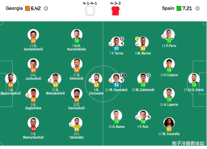 西班牙首发:23-乌奈·西蒙、12-波罗(46’5-略伦特)、15-库巴西、14-拉波尔特、22-库库雷利亚、18-苏维门迪、8-法比安(62’19-费尔明)、6-梅里诺(62’2-巴里奥斯)、16-巴埃纳、7-费兰(80’11-皮诺)、21-奥亚萨瓦尔(71’9-伊格莱西亚斯)。