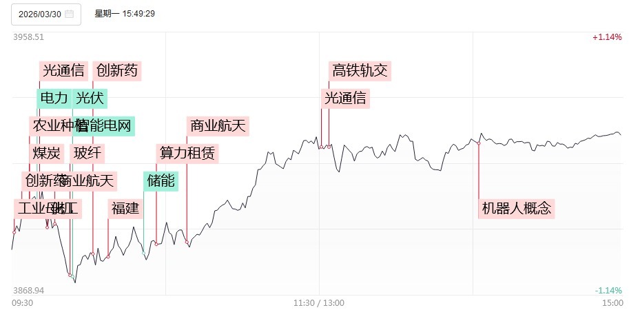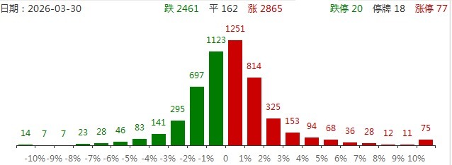 3月30日,市场探底回升展现韧性,沪指拉升翻红,此前一度跌超1%,创业板指、深成指跌幅收窄。截至收盘,沪指涨0.24%,深成指跌0.25%,创业板指跌0.68%。沪深两市成交额1.92万亿,较上一个交易日放量626亿。盘面上,市场热点重现快速轮动,全市场超2800只个股上涨。