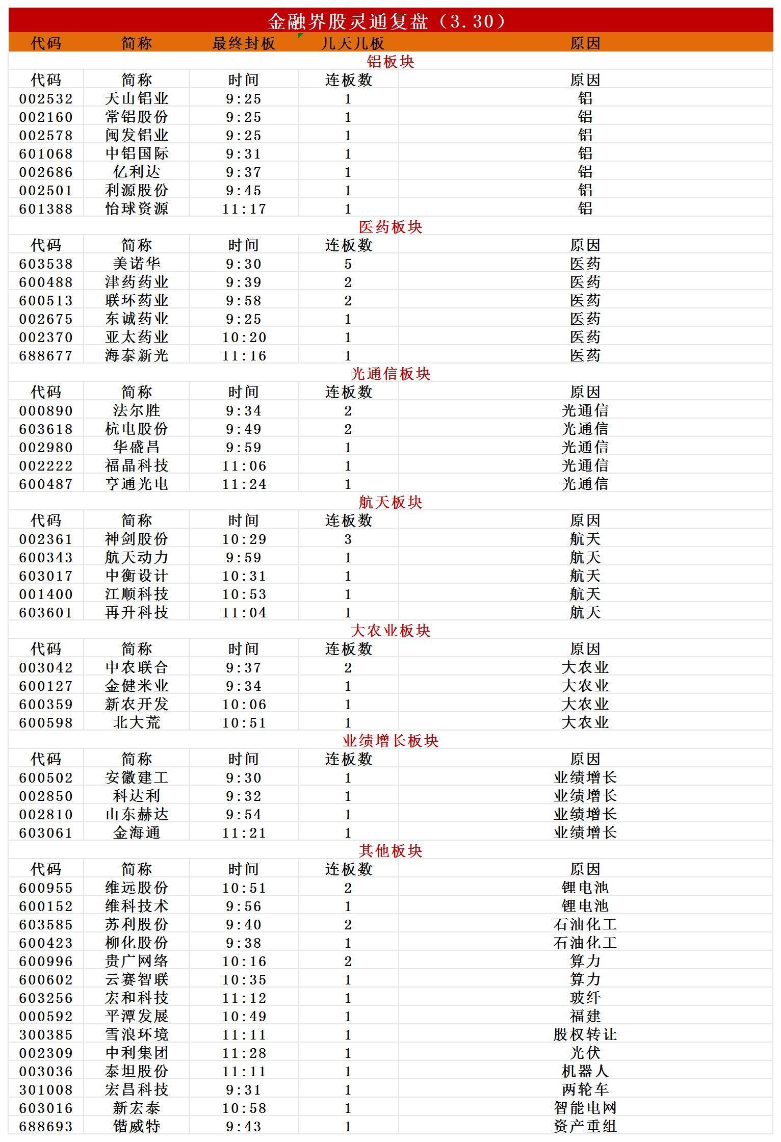 从板块来看,医药板块反复活跃,美诺华走出5连板,津药药业、联环药业双双2连板。商业航天概念探底回升,神剑股份3连板,再升科技4天3板,江顺科技4天2板,广联航空20CM涨停,航天动力、中衡设计涨停。有色·铝方向全天走强,闽发铝业、常铝股份、天山铝业、中铝国际涨停。光纤概念盘中持续走高,中利集团7天5板,杭电股份4天3板,法尔胜2连板,长飞光纤走出5天3板,续创历史新高。