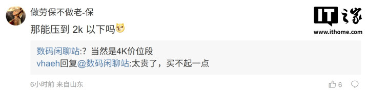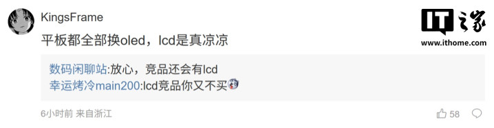 后续有用户在评论区表示:“平板都全部换oled,lcd是真凉凉”,博主回复道:“放心,竞品还会有lcd”;而另一名用户则询问道:“那能压到2k以下吗[狗头斜眼]”,博主则回复道:“?当然是4K价位段”。